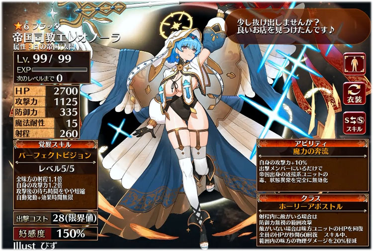 後述する覚醒アビリティ効果に射程バフがありますので好感度150%まで上げて運用したいですね。
