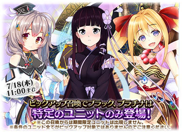 7月18日(木)11:00 までの期間限定でレアリティブラック、プラチナの出現ユニットが特定のユニットのみ出現するようになる「ピックアップ召喚」を開催いたします。