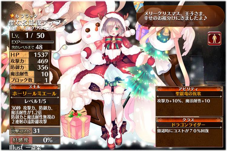 出撃メンバーにいるだけでクリスマス属性ユニットの攻撃力+10%、魔法耐性+5