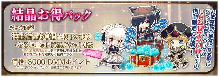 ショップにて期間限定で通常時よりも「神聖結晶」がお得に買える「結晶お得パック」を販売いたします。