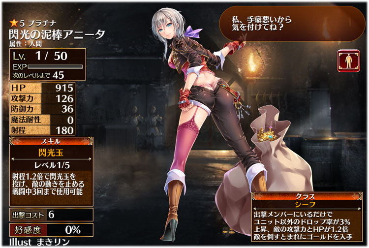 2015年8月27日のメンテナンス後アップデート時に実装された白金レアリティのシーフクラス女性ユニットです。