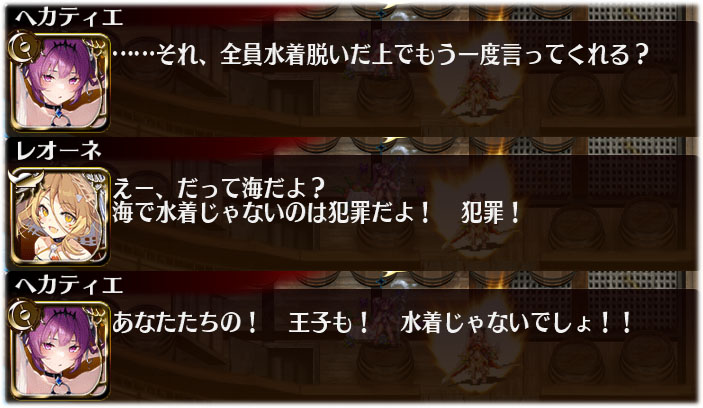 水着姿のヘカティエさん、呆れた表情で登場です。