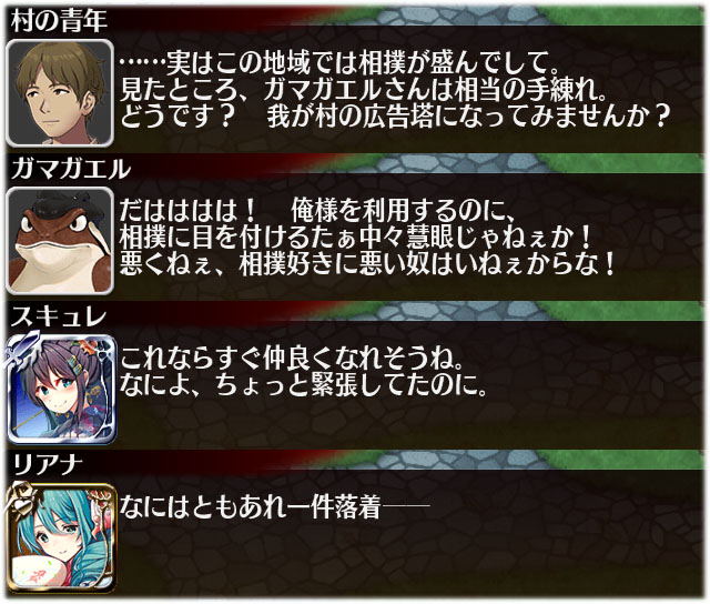 と、村人たちにガマちゃんを紹介するスキュレ。