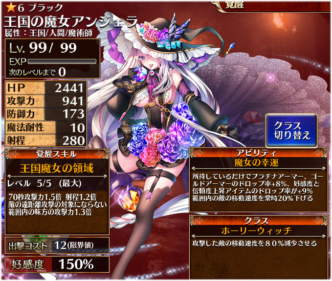 アンジェラの好感度ボーナスはHP+450と攻撃力+180に振られて、上限解放150%時には射程+20が付与されます。