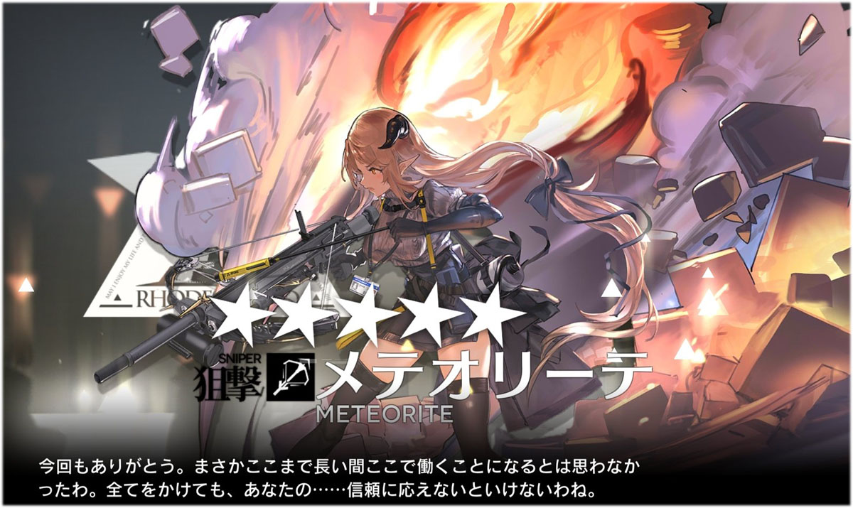 その際に各種協力契約を提案し、ラテラーノとロドスの友好的なビジネス交流を促している。同時に、任務においても極めて優秀な作戦能力を示しており、本人の意向もあって、現在はロドスの狙撃オペレーターとして各種任務で活躍している。