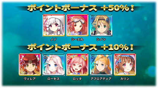 ボーナス+10%はURヴィレアさん、ロッタさん、カリンさん、SSRローセスさん、アプロアディアさん。